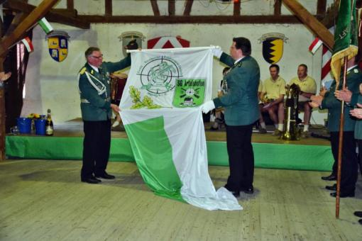 Ein erster Höhepunkt nach der Eröffnung des Schützenfestes am Freitagabend war unter anderem die Überreichung von grün-weißen Fahnen mit Emblemen beider Schützenvereine an den Schützenmeister der Artelshofener Schützen, an den Bürgermeister von Artelshofen sowie an den Schlossherren Heinrich Bischoff durch Präsident Thomas Müller.