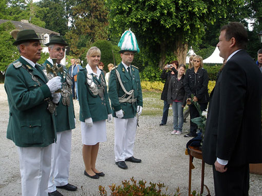 Der St. Kunibertus Schützengesellschaft wird das Kreuzpartikel übergeben und die St. Sebastianus Bruderschaft trägt die Schlossstandarte.