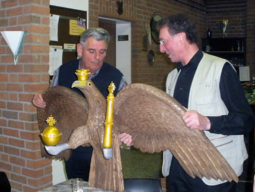 Dieser wunderschön in Holz geschnitzte Königsvogel wird künftig bei den Feierlichkeiten der Gesellschaft einen exponierten Platz erhalten. Er wird sicherlich nie eine Zielscheibe darstellen, sondern mehr über die "Abläufe" in der Gesellschaft mit Adleraugen wachen. Während seiner "Ruhephasen" wird er den Jugendraum der Gesellschaft schmücken.