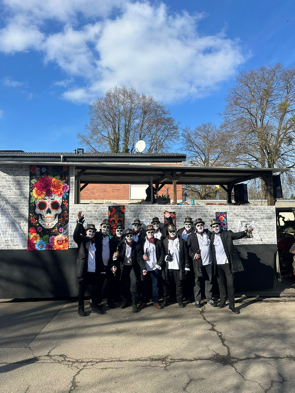 In diesem Jahr nahmen wieder zwei Gruppen der St. Kunibertus Schützengesellschaft am Karnevalszug in Gymnich teil. Zum einen die Offiziere, die mit bunt bemalten Gesichtern und schwarzen Gewändern den „Dia de los Muertos“, den „Tag der Toten“, darstellten und mit einem ebenso schön gestalteten Wagen durch die Straßen zogen.